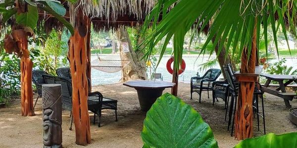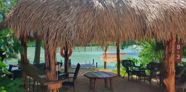 Our Hawaiian style cabanas are constructed with actual palm leaves for their roofs. Every cabana has: a picnic table, a hammock, lounge chairs, a BBQ pit, comfortable seating, running water and electricity, a private swimming/fishing dock, a bar top table and stools.